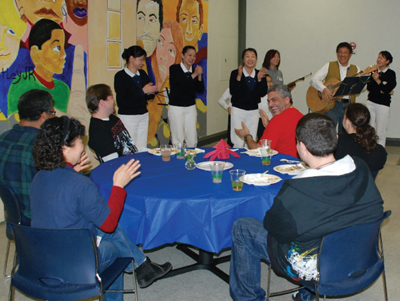 為了要讓收容所內的住民有特別的用餐氣氛,田師姐巧心佈置在每個餐桌桌上擺放春字及甜點,還有家貝弟兄也帶著吉他輕鬆的與小菩薩Amanda及Lucas一同彈唱,連現場的小朋友也忍不住一起同歡,住民在慈濟人的帶動下綻放笑顏。幾位慈少主動關懷住民,與他們話家常,人與人之間只要眞誠相待就沒有距離。有位住民表示,覺得自己很榮幸,因為住在收容所的這段期間,遇到兩次慈濟人的來訪,他說如果有一天自己有能力,也願意做一個幫助別人的人。