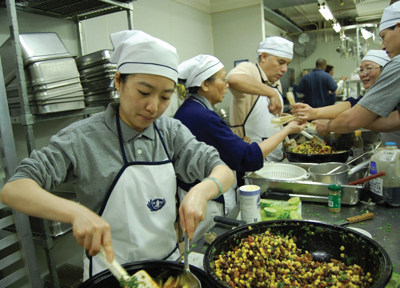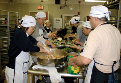 由於幾次的造訪,克里夫蘭救世軍收容中心內的工作人員,見到藍天白雲的慈濟人總顯現出他們歡迎及親切,下午二時只見各個功能組各司其職,此次預計發放330份熱食,廚房內志工忙著切切洗洗,第二次參加慈濟活動的鍾新次夫婦及其友人,今天的工作是要炸三百多份的芙蓉蛋,見他們滿身大汗卻仍笑著說很感恩付出,而不多話的墨西哥籍Mr. Ricardo Rayna,阿珠師姐在一旁翻譯說,他是一位很喜歡幫助別人的人,對慈濟的活動非常支持。見他們都做的那麼歡喜相信大家都是有福的人。