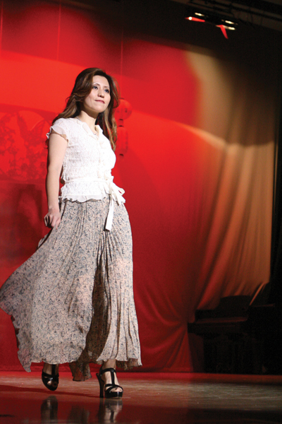 接下來的時裝表演"春韻",更象春天的綻放的一枝迎春花,將春的第一縷信息帶來。在強勁的音樂中,那嫩緑、水紅、嬌黃的各式晩裝,優雅大方;那深藍、淺紫、玫紅、黑色的各式鷄尾酒洋裝,活潑俏麗;那白色綉牡丹、紫色綉銀鳳、墨緑綉臘梅的旗袍,華貴雅致。女士們或高挑,或苗條,或豐盈,一個個緩緩走上台來,止步亮相,宛若春天里的詫紫嫣紅。