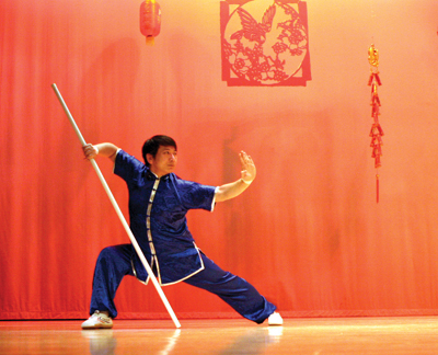 長城課外中心的武術老師曹勇先生表演的棍術,剛勁有力,威猛迅速,棍花翻卷,棍風呼嘯。
