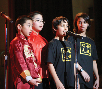 “長城功夫”的黑色T恤衫,飛馳而上,揮舞大旗,只見紅黃翻飛,銀光閃閃。接下來一群小俠士呼啦啦站滿了整個舞臺,二十多個五到十歲的小朋友表演初級拳,吼聲陣陣,氣勢不輸先前上陣的勇士們。接下來有各種騰跳、飛腿、跟頭,甚至空翻,還有拳術,刀術......精彩的表演贏得陣陣掌聲!