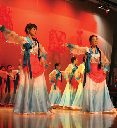 一群身著朝鮮族服裝的“姑娘”在溫馨歡快的“桔梗謡”樂曲中款款上台,她們邊玩邊舞,黑色的長辮,玫瑰色的圍兜,白色的長裙,在輕旋中揚起。十個人齊上齊下,旋轉輕舞,舞出了柔美,舞出了秀麗,舞出了歡樂,群舞的境界不在于個人跳得有多美,而是大家一起跳得美,跳出快樂與和諧。