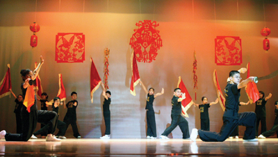 第一個節目,是氣勢磅礴的功夫表演。在"武林風"的音樂聲中,八面大旗迎風飄颺,年輕的俠客們身着印有