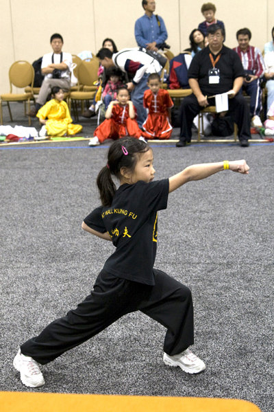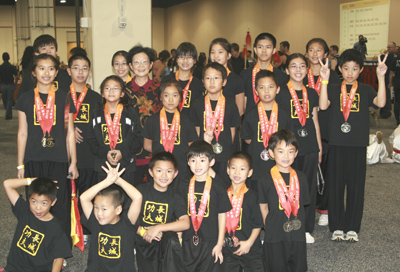 長城功夫中心的隊員們在胡康妮、曹勇敎練的指導下,自暑假六月份就開始了集訓。21名參賽選手中有已習武三、四年的老隊員,也有才加入功夫中心的初學者。無論是6歲學前班的小朋友,還是15歲的高中生,都能堅持每周三次的訓練。四個月的集訓時間雖短,但同學們的參賽項目卻豐富多彩:一路長拳、二路長拳、三路長拳、南拳、虎拳、七星拳、雙節棍、三節棍、功夫扇、峨嵋刺、標準刀術、標準劍術、醉劍、標準棍術、猴棍、樸刀,等等等等。同學們也建立了深厚的友誼。他們在平時訓練中互幫互學,共同進步。在比賽中互相鼓勵,