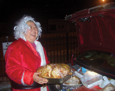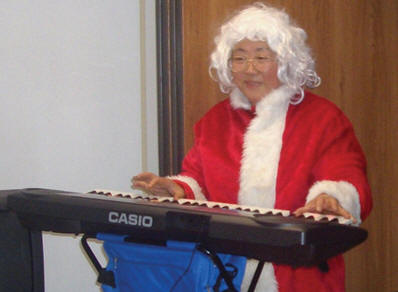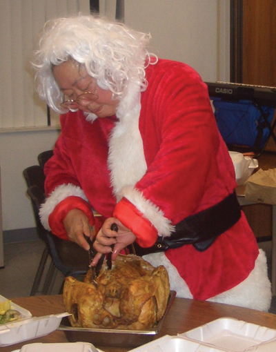 聖誕節當天氣溫極爲寒冷,但Victoria Chi- Lough和她的先生一大早就將整個車裝得滿滿的,全部是食物和禮物。在常靑公寓門口迎接他們的有任學武夫婦還有李媽媽等人,我們大家在亓女士的指揮下,將她車上的食物和禮品使用“人鏈”的方式接續傳遞到大樓里。亓女士從車後拿了一只40磅的火鷄,滿懷喜悅地對我説:今晩我們好好和老人們熱鬧一下,她手指着電子琴,要我把這只電子琴給搬進去,她要爲老人們演奏。她的熱情與這冰冷天氣正好是個反差,因爲是聖誕節,常靑公寓這天只有二十幾位老人。大家在觀賞亓女士彈的《鈴兒響叮噹》的樂曲聲中,吃着糖果,開始過一個與衆不同的聖誕節。