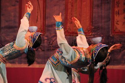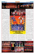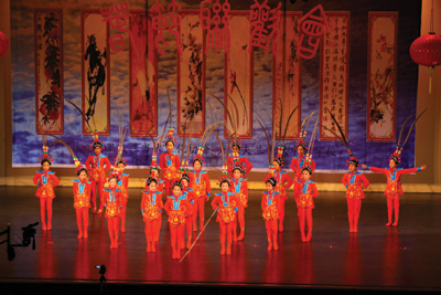 上台致新年賀詞並宣佈演出開始。舞臺大幕徐徐拉開,映入觀衆眼帘的是由湯年發與張小倫共同搆思設計的、具有濃厚中國傳統文化的天幕,八幅充滿古韻的中國傳統字畫懸挂在賞心悅目的藍天白雲中,使觀衆眼前一亮。天幕前,表演藝術家張凌雲老師指導的36爲小演員爲觀衆先上了一出充滿喜氣的《喜樂新年》,小演員們身穿各種中國民族服裝,個個精神抖擻,身手不凡,忽而翩翩起舞,忽而走隊形,忽而施展筋斗、金鷄獨立和下腰等高難動作,將喜慶的氣氛傳給了所有的觀衆。