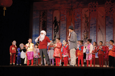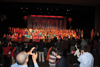 下午一點三十分左右,煕煕攘攘的人群開始涌入學校,各班的學生集合後在老師的帶領下,有序地進入劇場,在値班理事的安排下入座,家長、來賓區與學生、敎師區有序劃分。不一會,可容納1,000多觀衆的劇場已近滿座,六位報幕的老師與學生也在後台作演出前的精心準備,走廊上,理事們、老師們和家長們在逐個檢查每位候場學生的服裝與扮相,劇場內外一片生氣勃勃的忙碌景象。聯歡會演出于2點準時開始,除了少數負責安排演員上台的理事與負責秩序的理事外,30來位CCCCA理事會的理事在舞臺上一字排開,首先由理事長湯年發向所有參加活動的來賓、理事、老師、學生與朋友們表示感謝,並向他們介紹本屆理事會的成員;王黎明校長向協辦單位、贊助單位與個人表示感謝,黎博副理事長向觀衆介紹嘉賓,凌蘭萍副校長向老師們與學生們致節日問候,最後,所有理事們一起向觀衆拜年。今年的聯歡會來了不少嘉賓,Solon