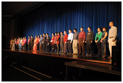 學生們在老師的指揮與安排下作演出前的認眞排練。開場舞蹈的30多名學生演員在張凌雲老師的帶領下,已經開始在熟悉舞臺;而負責舞檯佈景、音樂管理與劇場座位分配的理事們也在忙碌,長年積累的工作經驗使這些義務工作人員有條不紊地作演出前的準備工作。