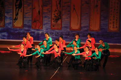 今年協會藝術團排練出陣容強大的迎新團體舞《歡樂中國年》,這些家長與朋友們在平時強身健體的鍛煉過程中,排出了動作優美、舞姿翩遷的團體舞,旣鍛煉身體又向新年聯歡會獻上了一個精彩的節目。演出的的最後一個節目是大合唱,在第二首歌曲《難忘今宵》的歌聲中,部分其它節目的舞蹈演員們緩緩走上舞臺,五彩繽紛的服裝,強大的陣容,在美麗風景與文化古韻的天幕襯托下,給全體觀衆留下了難忘的印象,個個都想“明年春來再相邀”。