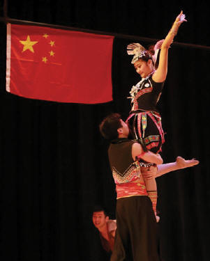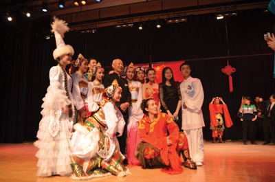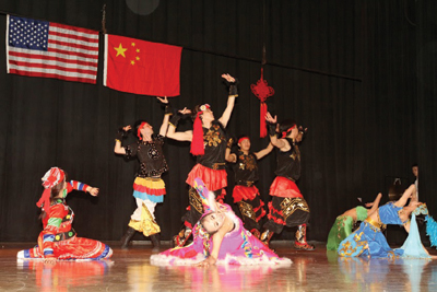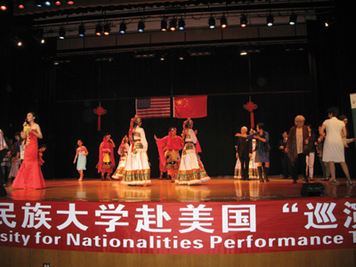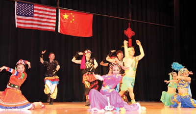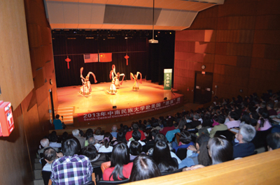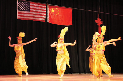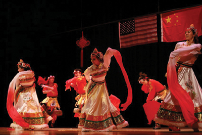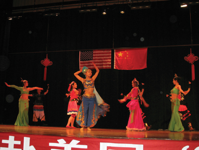 本地音樂社團克利夫蘭民族樂團應邀爲觀衆獻上了兩首優美的中國民族音樂《花好月圓》以及《花兒與少年》,獲得了觀衆雷鳴般的掌聲。隨後,中南民族大學學生藝術團的精彩節目“千呼萬喚始出來”。大學生演員們爲觀衆奉獻了一台藝術水準相當高的舞蹈、音樂、武術、戲劇節目。這些節目包括民族大聯舞《多彩中國》、女聲獨唱美國鄉村歌曲《蘇珊娜》、中國民歌《山歌好比春江水》、哈薩克族樂器冬不拉獨奏、土家族群舞《茅古斯》、川劇《變臉》、武術表演、維吾爾族舞蹈《來吧來吧》、蒙古族馬頭琴獨奏《萬馬奔騰》、《牧村春歌》、土家族苗族群舞《土家阿哥苗家妹》、傣族葫蘆絲獨奏、藏族男女群舞《溜溜的雲》。中間穿揷了克利夫蘭州立大學音樂系學生鄒嬋、林杰瑞(Zachary