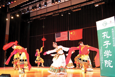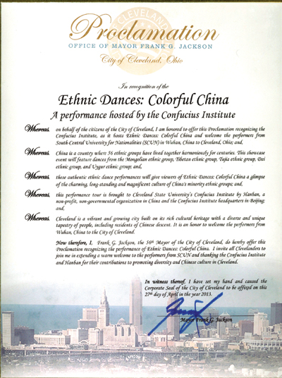 2013年4月27日,克利夫蘭州立大學孔子學院如期向公衆呈現了一場別開生面的中國少數民族舞蹈節目——“多彩中國”曁四川地震慈善演出。克利夫蘭市市長Frank