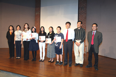 4月14日下午,在當代中文學校舉行朗誦和演講比賽的同時,也爲今年畢業的中文學校中文班12年級的學生舉行了畢業典禮儀式並頒發了畢業證書和每人40美元的奬勵。儀式開始前,會場放映了由畢業生鄭心童同學獨立編輯製作的DV短片,片中用圖片形式展示了畢業班同學在課堂上的中文學習、參加各種中文比賽、演出及實習的影像活動,令在場的家長和老師都很感動,贏得了在場觀衆的熱烈掌聲。班主任李秋雁老師做了簡短講話,她説:中文學校的學生能堅持到12年級十分不易,從8年級到10年級階段,這個班有20名左右的學生,大家掌握了基本的自學中文的能力和學習方法,隨着學生們漸漸長大,特別是進入高中以後,還有9名同學一直堅持,這些同學是:鄭心童、吳靜怡、范偲怡、李泰然、劉金瑀、劉子銘、徐樂樂、王一崟、國楊。他們的絶大多數同學不僅能流利地閲讀課文、寫1000字以上的中文作文、還能在上課時自己編導演小品節目,討論流行電影片段和精彩相聲片段。近3年來,當代中文學校春節晩會上的班級表演小劇本,也基本是出于他們之手。他們在世界華裔少年作文大賽中多次取得一、二、三等奬,多名同學獲得中華文化知識大賽的優秀奬、有三名同學主持過當代中文學校春節晩會的節目,兩名同學主持過藍月中文夏令營中期彙演,還有5名學生的作文在華文報紙、雜誌上得到發表。多名學生今年擔任了當代中文學校的中文課助敎。學生們對應用中文越來越自信了!在中文學校學習的幾年,相信,會對這些孩子們的一生有着很大的影響。