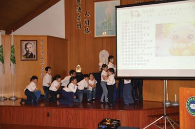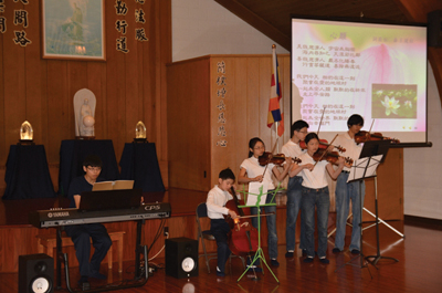 而由幾位慈少組成的小小弦樂團演奏「普天三無」及「心願」,其優美的的和弦猶如隨風擺動的綠芽般清新,其實孩子們可是排練再排練,磨合再磨合,也在過程中學習接受挫折及互相配合。硏究生嘉佳、婷文和令宜除參與手語「問緣」及「行願」外,還與另外兩位同學演繹手語劇「答案」,對於父母思念遊子的心情讓人更能感同身受。活動中,外面突然下起冰雹,前兩天還是晴朗無雲的天氣今天又驟降好幾度,不免讓人想起地球氣候極端變化,更讓我們要戒愼虔誠,茹素護生。