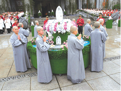 十二日清晨七點,在九十四位靜思精捨法師的引領下浴佛,三千多位各界代表、實業家、慈濟人同聲齊唱〈爐香讚〉,在浴佛偈誦中,以雙手沾香湯浴佛,虔誠「禮佛足、淨心地」,場面莊嚴。