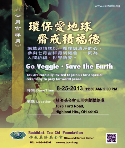 迎接農曆七月,克里夫蘭慈濟基金會推動「環保愛地球 齋戒積福德」活動,將在八月廿五日上午11:30