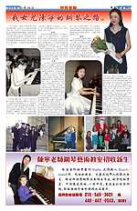 陳寧十幾年以來敎授過各種程度和不同年齡段的學生,敎學經驗豐富,因材施敎,三十餘年,她已將中美數位名師的學術精華集于一身,希望陳寧在這條三十年築成的鋼琴音樂之路上,走出你絢麗多彩的人生,這就是你的成功之路。之所謂成功之路的意義就在于你要爲人師表,毫無保留地敎導好你的學生。在爲你喝彩的同時,向你説聲“謝謝你,女兒”! 王茜