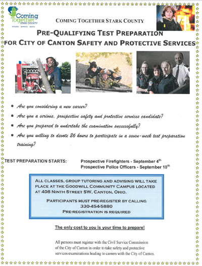CANTON, OH: Coming Together Stark County will be offering Pre-Qualifying Test Preparation for City of Canton Safety and Protective Services in advance of the qualifying examinations for City of Canton firefighters and police officers on October 15, 2014 and November 4, 2014.