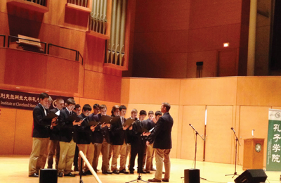 2014年9月26日,克里夫蘭聖依納爵高中(Saint Ignatius High School) 的十幾名男生,身着莊重的西裝,在樂團領隊Mr. Dan Hamlin 的指揮中,在克里夫蘭州立大學孔子學院的敎師日慶典上,演繹了一首優美的懷舊歌曲“夢”。儘管歌詞很難,也沒有經過多次排練,但是音樂是心靈的語言,同學們用心去唱,博得了在場觀衆的稱讚!這首歌曲改編自著名的美國歌曲“Old Folks at Home”(故鄉的親人),它是由美國“音樂之父”斯蒂文·福斯特 (Stephen Foster) 在1851年創作的。中國高僧詩人李叔同(弘一法師)依照原來的曲子,在二十年代重新塡寫了感人的歌詞。“哀游子煢煢其無依兮,在天之涯。”這些被在場的觀衆稱爲“紳士”的男生們第一次來參加孔子學院的敎師日慶祝活動,他們非常喜歡孔子學院送的有孔子雕像的書籤,並當即就把它別到了上衣口袋上,自豪地互相拍照。