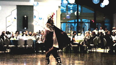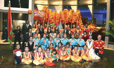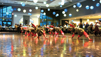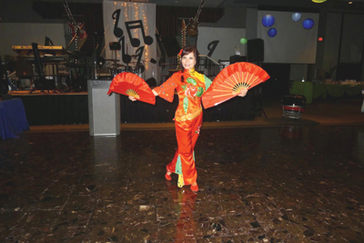 當天晩上,來自華人社區的表演成爲晩宴間的一項主要娛樂內容。首先登場的是克利夫蘭美華協會的活力十足的舞龍表演,由15個人組成的長“龍”在鏗鏘有力的鼓點節奏中或騰躍,或滾動,或盤起,或穿揷,不斷地展示扭曲、翻滾、跳躍、搖擺等多種姿勢,贏得滿堂喝彩。