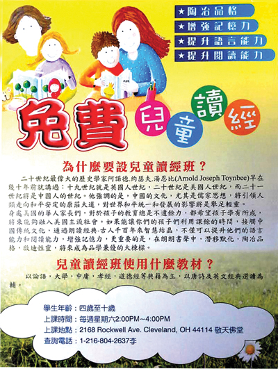 敬天佛堂已於2014年10月13日安座落成。並訂於2015年3月份設有免費兒童讀經班,為提昇孩子的智慧及學習能力。敬請家長及早報名。地址:2168 Rockwell Ave Cleveland, OH 44114( 敦煌宮酒樓 側)電話 : 2168042637(李)