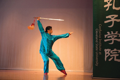 將整場表演推向高潮的是克利夫蘭州立大學孔子學院的崔艷華敎授,一身寶藍色的武術服,伴隨悠揚的《牧羊曲》,看起來柔弱嬌小的崔敎授以令人抖擻的爆發力、瀟灑利落的武術動作、手起劍落的身形和姿勢瞬間將全場點燃,在台下就坐的學生和家長們目不轉睛,驚嘆中國功夫的神奇與精妙。三分鐘的表演,禮堂內只聽到崔老師表演的劍聲和步伐,等崔老師完成這套精彩的劍術表演時,觀衆掌聲雷動,都感覺到自己的眼睛還沒有過癮,希望能有機會再看到崔老師的表演。