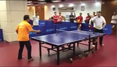 倆人光着腳丫就開始友誼比賽,比分幾乎是打平,最後洋市長對我説:直覺讓他不能贏這位小鎮領導,最後他輸了一分球,大家在非常激烈又高興得氣氛中比完了這場沒有安排的乒乓賽,相互增進了友誼。