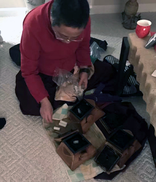 我的朋友陳小萍全家要搬回台灣,認識陳小萍師姐是1998年,那個時候我們一起參加慈濟讀書會,一起跳舞,她是我們的老師,她給我印象很深,説話不多很有能力,我説她是一個高人,她知道自己在什么時候要做什么的人,他們一家在美國已經生活20年,現在決定回台灣照顧年老的父母。她將佛像心經與我結緣。