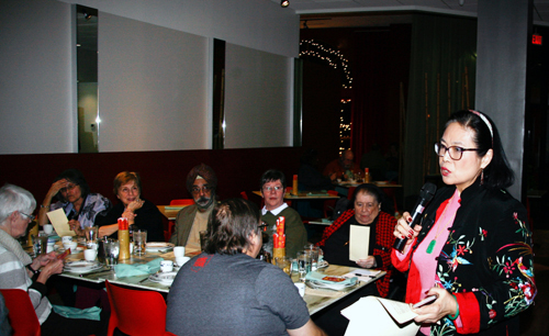 活动伊始,大家一道道享用地道中餐的同时,黄承生动地介绍了中国餐饮文化的特点和内涵、中国就餐礼仪等,她也具体介绍了“鱼”在中国餐桌上具有“富裕”的吉祥含义、长辈给晚辈压岁钱的方式和寓意等。令大家惊喜的是,主办方向大家赠送了一个中国式红包,红包里是一枚中国铜钱;大家兴致勃勃地议论起中国铜钱代表的中国古代的“天圆地方”之说。