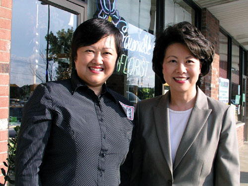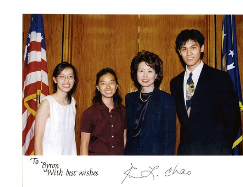 40年後,這個小姑娘成爲美國有史以來第一位華裔內閣部長,她曾爲美國二屆政府服務過,目前她是布什政府連任所要依靠的五朶“金花”中的一朶,當然,她也是一個“令天下華人同感榮幸的炎黃兒女”。