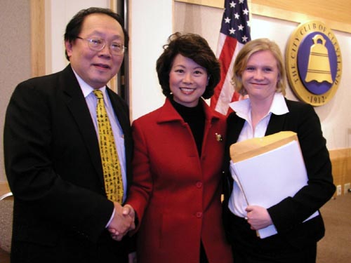 CLUB演講完,華人想和她一起照相留念,她身邊人説時間來不及了,沒有想到勞工部長親自動手,放椅子招呼大家一起拍照留念,她還一一和大家握手,祝福大家節日快樂!而這第三次見面,她和我竟然單獨談了二十分鐘,她爲我到飲料,問我從哪里來,當我説我是上海人時,她還講了一句上海話:我爸爸是上海人,她吿訴我自從九十年代她去過上海至今還沒有時間回去看看,不過她的妹妹常常回上海,吿訴她中國發展迅速。