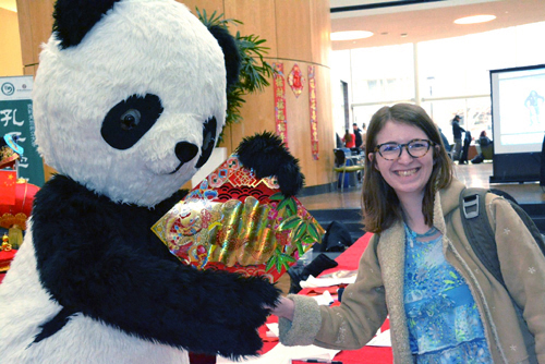 图:前来观看的学生们在孔院展台前与“大熊猫”合影留念!