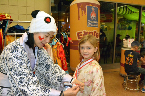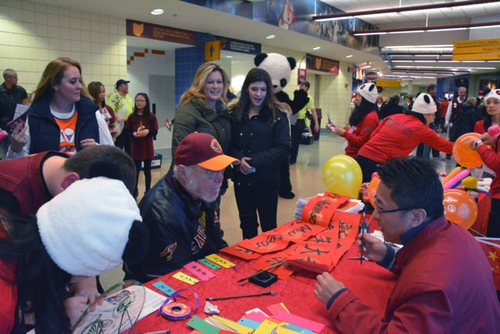 本次活动旨在进一步加强孔子学院与当地主流团体的合作、进一步促进普通民众对中国文化和中国社会的了解。孔子学院在速贷球馆设有三个展台,两个为书法展台、一个文化体验台;其中一个书法展台应骑士队要求而设,特别为骑士队季票球迷取中国名字,体验展台为中国传统服饰试穿展台,涵盖了小礼品发放、孔院课程、文化项目宣传等,展台外,憨态可掬的“大熊猫”与球迷互动频频。展台前观众络绎不绝,每一个孔院教师一个顶俩用,忙得不亦乐乎。孔院人的耐心、热情以及敬业精神赢得了观众们的一致好评,“孔子学院真棒”的称赞声不时传来。孔院教师的书法取名展台在两个小时内为大约两百个球迷取名,拿到自己的中文名字卡后,他们还请孔院教师教他们发音,道一声“谢谢”后,念着自己的名字,满意地去为比赛助威了。孔院教师的红色体恤、红灯笼、红对联、红桌布、红色的中国结、独具中国特色的红包汇集成的中国文化,渲染着中国年的气氛。此外,腾讯、乐视和美国福克斯体育频道(Fox