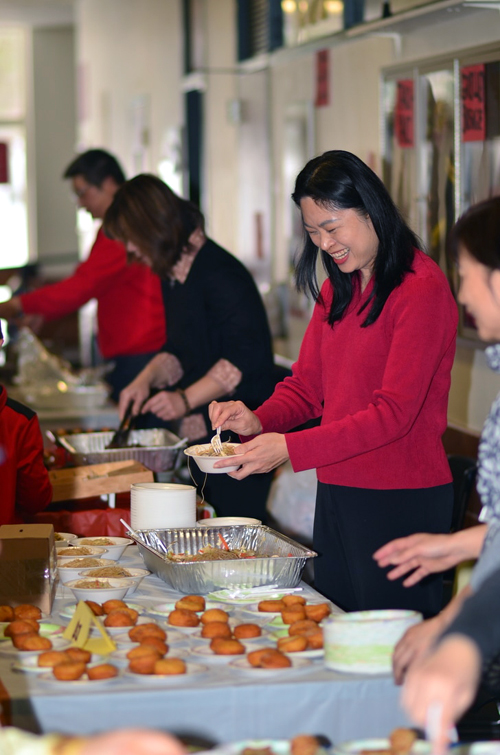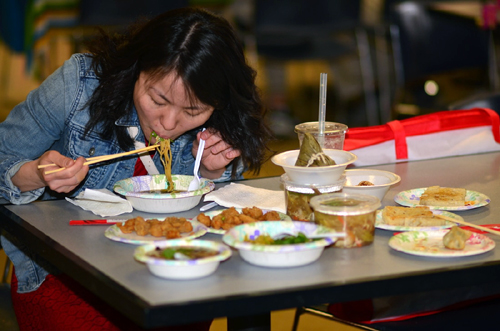 新年活動當天起了個大早,邊煮著珍珠奶茶和波霸粉圓,邊看著電視上的氣象報吿,雪果然如預測般的停了!到了中文學校之後,看著大家為了準備我們著名的夜市小吃中餐,忙得不亦樂乎,有炸鹹酥雞的,煮牛肉麵的,蒸燒賣的,烤香腸的,完全忘了上個禮拜東邊買駿馬,西市買長鞭的辛勞,是上天的祝福吧,讓我們為了迎接新的一年又歡聚一堂!