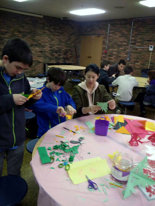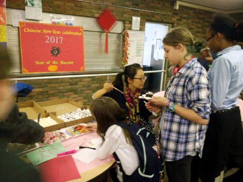 充满喜庆氛围的大红灯笼、中国结高高挂起,浓郁的中国文化气息扑面而来。活动分为几个区域进行,这边的学生毽子踢得正欢,那边的学生在安静地挥毫泼墨;这边的学生正专注于手中五彩缤纷的剪纸,那边的学生在笨拙地拿着筷子努力把美味的饺子放入口中……丰富的文化周活动内容受到师生热烈的欢迎和一致的好评。