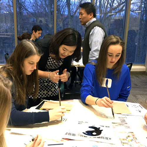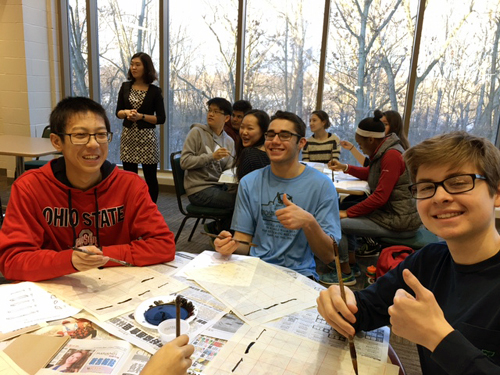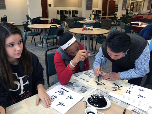 美国当地天还未亮,两位老师便驱车前往该高中,该校中文教师张真娜老师早早就在活动室等候。此次讲座中,孔院核心教师李惠文简要讲解了汉字的起源、书法在中国文化中的地位、与中国哲学的关系、汉字和书法字体的演变,并带领学生们实际体验,学生们从坐姿、执笔到起笔、行笔都做得有板有眼、极为认真。此外,孔院教师还特别带领大家体验了“逆风起笔”和“中锋运笔”在书法中的体现,学生们对书法的解读与体会在笔下的每个汉字中一一展现出来。随着一撇一捺的认真学习,学生们对书法的兴趣逐渐加温,纷纷挑战高难度的汉字来写,陶醉在中文课以外的汉语文化学习中,也亲身体验了“文房四宝”的独特魅力。