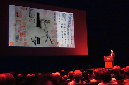 何慕文深谙中国文化,他的讲座由浅入深、通俗易懂。他讲中国画欣赏,却从中国文字说起,从中国文字和西方的26个字母的关系说起,即刻拉近了听众与中国的关系,他也把中国的书法、中国的草书与绘画、与苏州石的形态做对比,让不懂中文的人即刻领略到中国书法的美妙和韵味;他把纽约大都会艺术博物馆的藏品与克利夫兰艺术博物馆的藏品进行对比,拉近了作品与观众的距离。他对比不同朝代对山水、景观、人物和花鸟的不同表达,形象地展示了中国绘画的发展、审美、内涵和意境;他像介绍老朋友那样评介作者,让听众对那些久远的作品不再有陌生感和距离感,而是充满了亲切感和亲近感。整场演讲中,何慕文介绍了从唐宋到明清的绘画艺术,着重介绍了唐朝韩干的《照夜白图》、唐朝钟绍京的楷书《灵飞经》、北宋黄庭坚的草书《廉颇蔺相如传》、屈鼎的《夏山图》、郭熙的《树色平远图》、南宋马远的《高士观瀑图》、元朝钱选的《王羲之观鹅图》、赵孟俯的《双松平远图》、明朝阮祖德的《抑斋曾叔祖八十五龄寿像》明/清陈洪绶的《橅古图》等名作。整场演讲,何慕文不仅介绍了中国的艺术,还在不知不觉中介绍了中国的历史、文化、哲学和政治,他以丰富而厚重的中国历史文化艺术修养和底蕴折服了听众,赢得了观众的阵阵掌声;他以诙谐幽默的话风,对比了中国文化和美国文化。这是一场很学术的讲座、也是一场很通俗的讲座,是讲座者与听众的对话,也是听众与中国文化中国传统的对话。