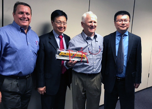26 日下午3:00,全體學員到了工厰,在Bryon Shafer先生帶領下,我們到了已經準備好的“課堂”,總裁Jack親自爲大家講解公司情况並做産品介紹,學員積極提出許多問題,當中車北京二七機車有限公司副總經理曹岩先生贈送車模型的時候,總裁Jack 一下興奮起來,他讓Byron從墻上拿下鏡框,高興地吿訴學員這是1946年芝加哥第一輛火車,就走克利夫蘭,就是他爺爺親自參與組裝的。Jack還吿訴大家,他有50輛不同年代的火車模型,今天中國朋友贈送的是他第51 輛模型,他請大家去參觀他的小小紀念館,這是公司人員贈送Jack的生日禮物,留下他們全家族四代人的耕耘足迹。