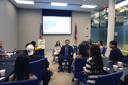 最后,门振庭先生介绍了具有克利夫兰特色的华人创业协会。该协会不仅有对创业者的资金支持,依托克利夫兰强大的制造业帮助创业者实现自己的梦想,还有帮助广大海外留学生,特别是中国留学生包括入学、求职在内的一系列服务。门振庭先生希望大家以后有机会能来到克利夫兰进行深造,在克利夫兰这个富有人情味的城市里开创属于自己的一番事业,与当地华人一起共襄盛举!   中国石油大学(华东)赴美交流团一行通过对克利夫兰商会的参观,加深了对这座城市的认识。同学们表示,在如何平衡城市发展与环境保护上,克利夫兰这座城市有很多优点和长处值得学习。与此同时,克利夫兰当地强大的医疗资源和开放的教育理念也让所有人赞叹不已,对于今后每个人的职业规划有较好的参考价值和借鉴意义。