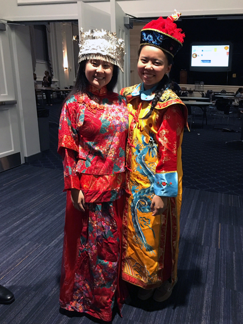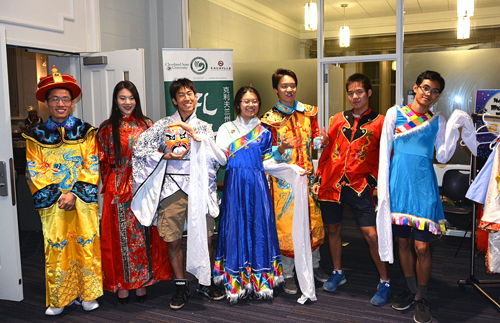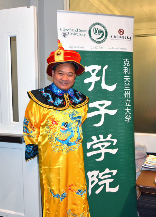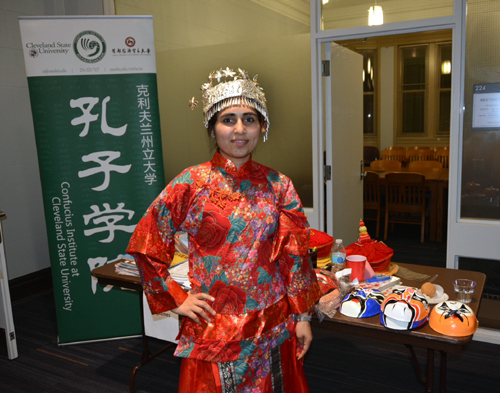 克利夫兰州立大学孔子学院在活动现场设置了文化展台。展台上的京剧脸谱、民族服装服饰、孔子学院活动宣传页、还有大多数80后90后学生的童年回忆“大白兔奶糖”,引得来往的学生们纷纷驻足,而其中最受欢迎的当属试穿色彩鲜艳、特色鲜明的民族服饰。一个美国男孩带着皇帝的朝冠过了一把皇帝瘾,而印度女孩穿起嫁衣、带上苗族头饰后就变成了美丽的新娘。一位陪女儿来参加活动的爸爸穿着了龙袍,金发碧眼的小女孩则拿着鲤鱼旗、懵懂又好奇地戴上了京剧脸谱。一群华裔学生兴奋地穿上了汉、藏、满族的不同服装,摆出各种搞怪的姿势合影留念,更是上演了一幕“满族皇后”和“藏族公主”的“宫斗戏”。汉服的端庄,藏族服装的飘逸、满族服装的华贵、苗族头饰的精巧全部展现了出来,大家玩得乐此不疲。在这样一个阖家团圆的节日里,虽然留学生们身在异国他乡不能和家人团聚,但在这一刻,大家身着各色民族服饰相聚在这里,快乐也定格在这里。而对于外国学生来说,在这个中国传统佳节,和中国人一起品尝中国美食、体验中国文化,也是个丰富又难忘的中秋之夜。