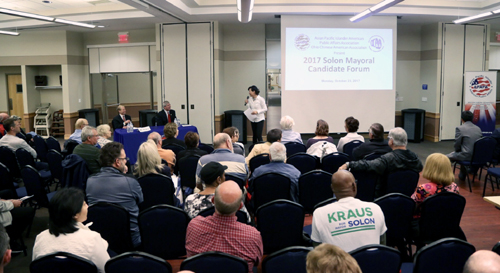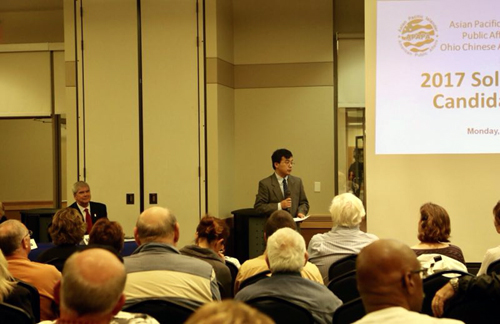 眞爲我們中國朋友自豪!第一次由華人在Solon組織的“市長候選人論壇”就大獲成功。大廳里坐滿了市民,在美女主持人的執掌下,選民紛紛提問題,和候選人熱烈互動。聽了之後,感覺到候選人Eddy