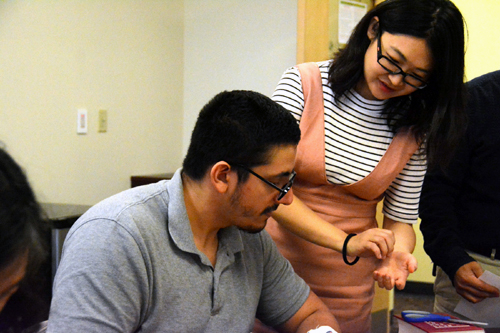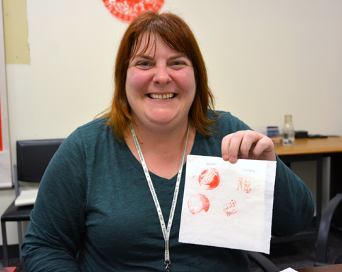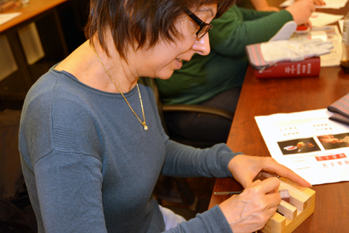 比起中国画,习惯于签名而不是盖章的美国学生对篆刻则有些陌生。篆刻课程老师从篆刻的历史讲起,简要介绍了篆刻艺术的沿革、发展、小篆字体的选择以及在中国传统艺术作品和日常生活中的作用。在实践部分,学生在老师指导下,先后尝试篆刻了阴文(红底白字)的“福”字和阴文自己的中文名字,甚至有学生刻出了难度更高的阳文(白底红字)“福”字,所用的材料也由第一次的胡萝卜开始逐渐增加难度,直到最后一次课用篆刻专用石头刻出自己精美漂亮的中文名字。蘸上朱砂,在宣纸上小心翼翼印下去,一枚枚红色的印记引来大家连连“amazing”(“太棒了”)的赞叹。