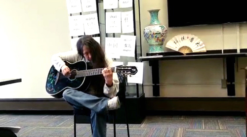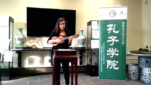 当地时间12月7日两个班级的同学满怀信心地进行了合作表演。中级1班的学生艾世丽朗诵了苏轼的《江城子》“不思量,自难忘”情真意切,伊恩则背诵了唐诗《锄禾》和《静夜思》;艾灵盾演唱的一首《安静》优美动听,中级2班的琳达和万莎更是各显身手。琳达吉他弹唱《爱你在心口难开》,万莎弹着尤克里里唱出一曲《执着》得到现场同学们的阵阵掌声。在集体表演部分,艾灵盾扮演了到中国朋友家做客的美国女孩,万莎等人则扮演了热情友好的中国家庭。剧本完全由学生自己编写,每个人负责自己角色的台词,都充分运用了本学期学过的生词和语法,语言得体、故事生动有趣,语言能力和才艺都得到了充分展示。