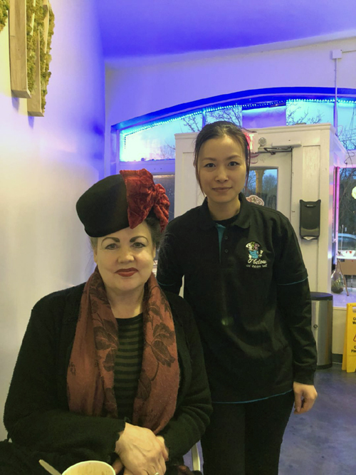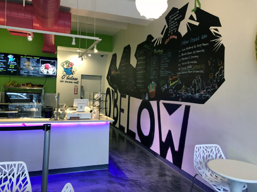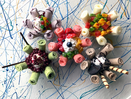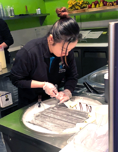 我看着Jenny在杯子里放顧客要的口味,先調成水,再放在冰冷的“爐子”里成形薄餅,再卷成筒狀,放上水果,好精緻的藝術品。當日我與好朋友Cynthia在那里聊天品嚐,Cynthia