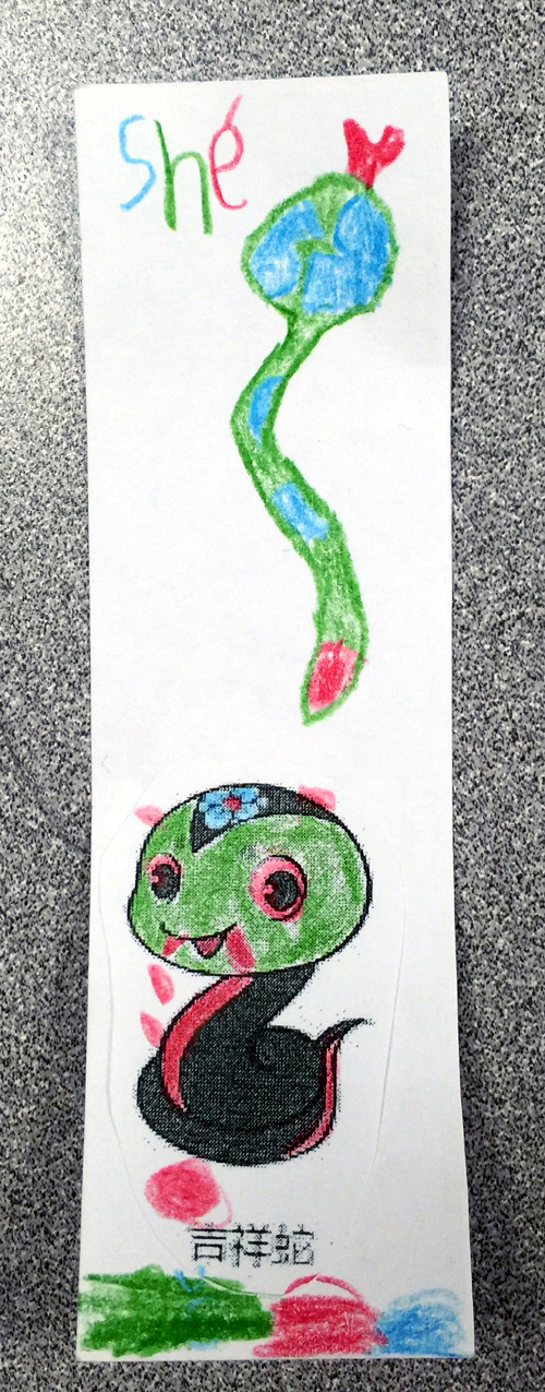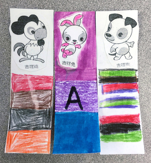 有的学生对中国的十二生肖感兴趣,我在讲动物主题的时候,把十二生肖引进教学内容,教学生制作生肖书签,学生非常喜欢,拿着做好的书签告诉我:“我属狗。”“我属鸡。”有的不仅制作自己的生肖书签,还给自己的家人制作,做为小礼物送给家人。