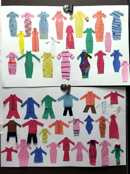 有的学生对中国的传统服装——旗袍很感兴趣,在学习颜色的时候,我准备了很多彩纸,课上让学生学着表达“我喜欢……色。”学生说出自己喜欢的颜色,就可以得到一张相应颜色的彩纸,我带领学生用彩纸制作小旗袍,很简单的步骤就可以制作出各具特色的旗袍,学生的创意还是很丰富的,第一次让我感觉我们的旗袍还可以这么“潮”。