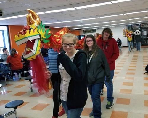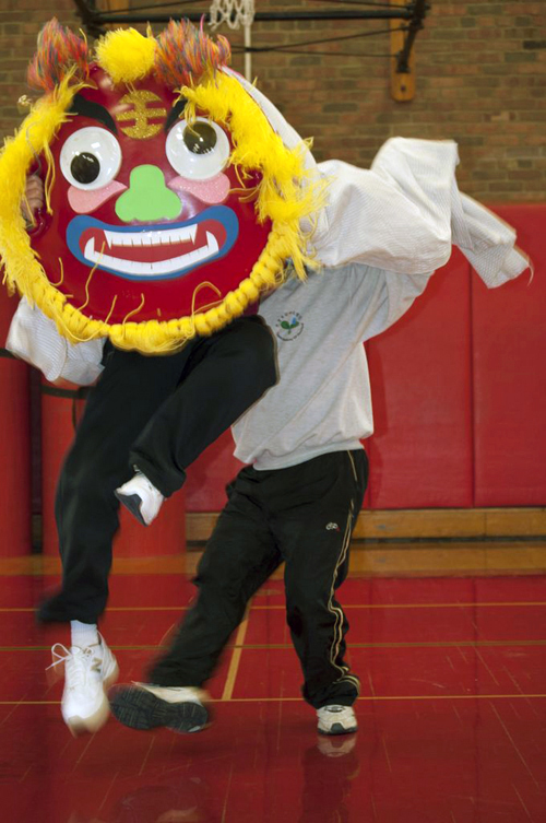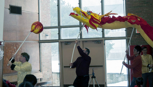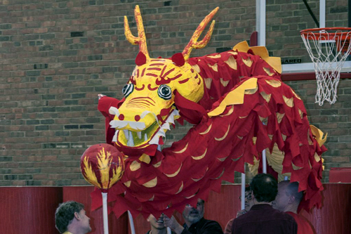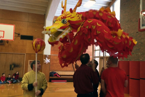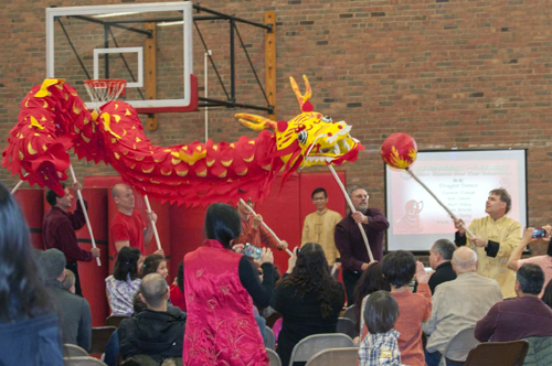 接下來的節目,是由六位學生家長們組成的隊伍,為大家帶來了一段精彩的舞龍表演。栩栩如生的巨龍,隨著龍珠,穿梭於觀眾之間,身軀時而蜷曲,時而伸展,將活動帶入了最高潮。節目最後由敎務主任、校長、及學生家長,為大家帶來了一段爆笑舞獅秀。獅子除了從主任手中接下了春節代表性的紅包,並藉著搞笑的動作,讓在場的觀眾及來賓們,隨著獅子逗趣的步伐,在歡笑聲中結束了今天的所有演出。