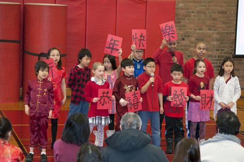 為了讓節目的節奏更歡樂緊湊些,今年特地設計了紅白對抗的橋段。首先登場的是CSL學生共同歡唱「新年好」及「恭喜恭喜」等應景的歌曲。這兩首歌的歌詞對CSL學生來説,簡直是一項的不可能的任務,然而大家在老師的敎導及辛勤的練習之下,竟能唱出一口標準的中文。接著由二年級學生演出登鸛雀樓詩歌吟唱。二年級學生藉著自行製作的道具佈景,搭上逗趣的對白與演出,將詩人王之渙的作品,以一種活潑詼諧的方式,賦予古詩另外一種不同風味的詮釋。