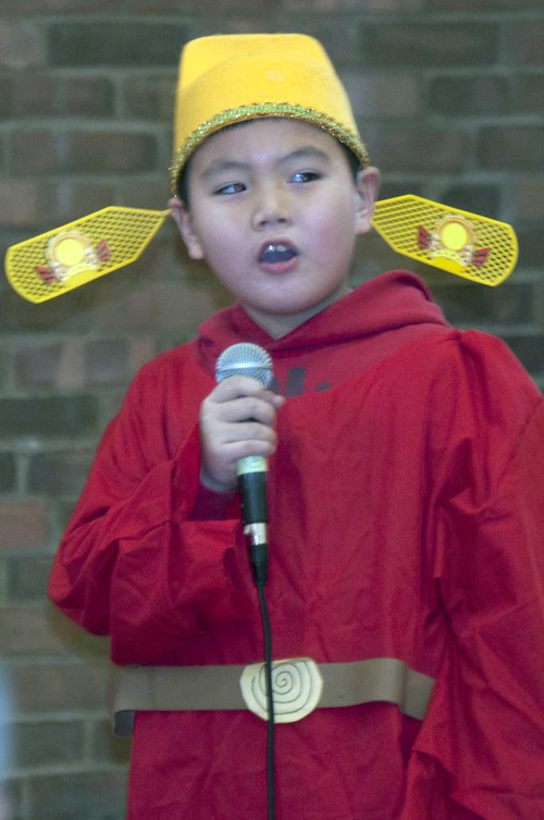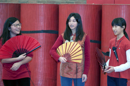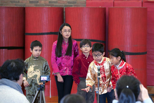 在五年級學生的中英文吉祥話串場之後,一陣陣鑼鼓聲由遠而至,列隊進場的是三年級的學生。原來鑼鼓聲所帶來的,即是中國民間的傳統曲藝表演—三句半。學生們先以三長句起頭,再以簡單三個字結尾,搭配鑼鼓的節奏,押韻、詼諧、搞笑,為大家帶來了一段精彩的俏皮話。八年級的三位學生也不甘示弱,以三口相聲的方式,為大家示範了一段漢字構成方法之一—會意字的組成原理及用法。幽默的對白,逗得在場來賓們哈哈大笑。