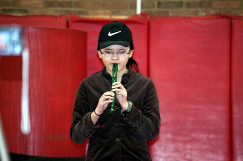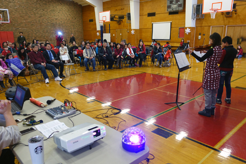 在欣賞了一連串歌唱與對話的表演之後,兩位六年級的學生為大家帶來了小提琴二重奏。默契十足的兩位小朋友,透過熟練的演奏技巧,宛如兩隻出谷的黃鶯,此起彼落,奏出了一段動人悅耳的奏鳴曲。去年畢業的校友,也回來為大家演出了豎笛獨奏,電影鐵達尼號主題曲—My