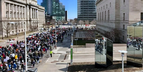 演講之後,大概中午12點,大家開始沿着事先設計好的路線,在克利夫蘭的商業區環繞遊行。人們從公共廣場出發,擠滿了克利夫蘭的主要商業街,高呼要求改變槍支立法的口號前進。